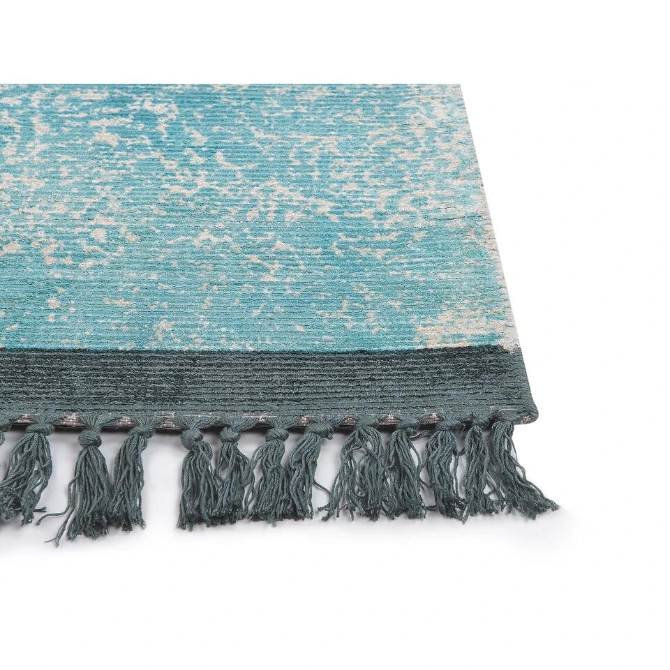 Vintage tapijt met decoratieve franjes . Versier je woonkamer of een andere ruimte in je huis met deze vintage vloerkleed. Opvallend is ongetwijfeld het patroon – verweerd, met een sterke oosterse sfeer, het zal zeker opvallen en de huisgasten charmeren. Het heeft een prachtige kleurencombinatie, is gemaakt van viscose, dat prettig aanvoelt en gemakkelijk schoon te maken is.