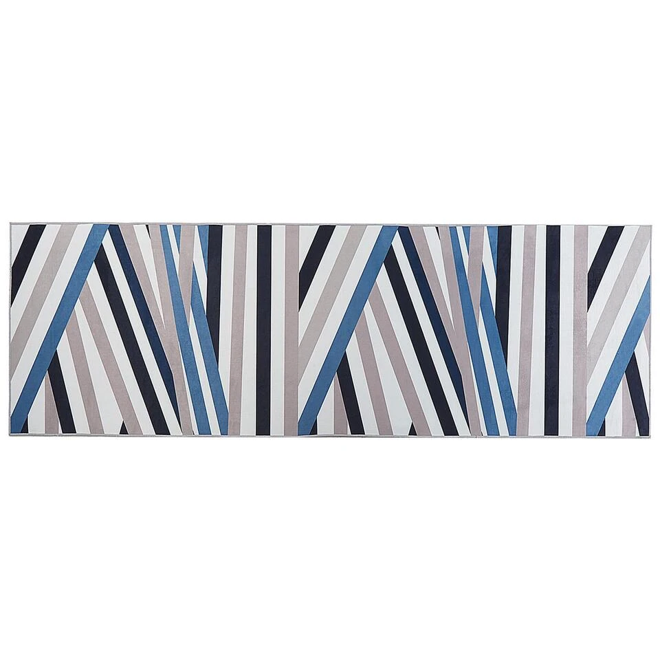 Modern tapijt met geometrisch patroon. Dit meerkleurige tapijt is een geweldige keuze voor lange en smalle gangen of gangen. Het stijlvolle geometrische patroon met zwarte, beige, witte en blauwe strepen staat trendy in elk interieur. Door de lage pool is het tapijt makkelijk schoon te maken. De antislipbasis maakt het tapijt een perfecte keuze voor zelfs het drukste huis.