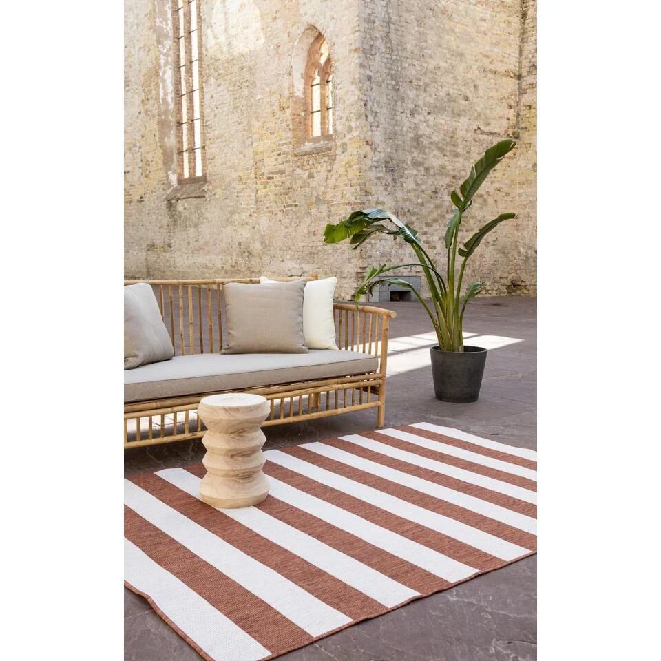 Buitenkleed Stripes roest/wit is een vloerkleed voor buiten, maar ook voor binnen! Verkrijgbaar in 4 verschillende kleuren en 3 verschillende afmetingen; 160 x 230 cm 200 x 300 cm en 240 x 340 cm. Dit vloerkleed is dubbelzijdig, je kan het omdraaien voor de tegengestelde kleuren. Perfect voor wat afwisseling! Het verminderd ook kans op vlekken op buitentegels en dekt onkruid af.