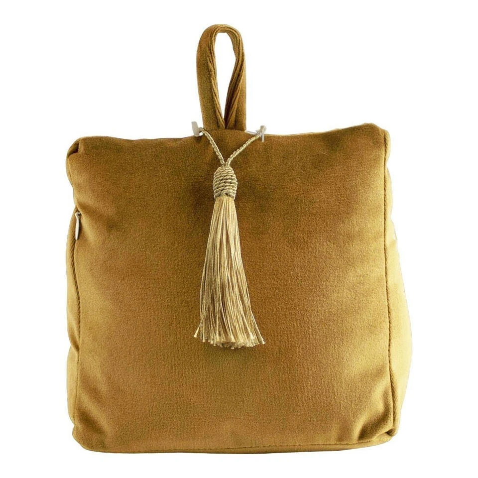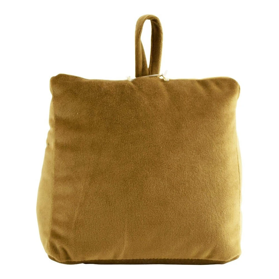 Deurstopper fluweel koperkleur. Deze koperkleurige fluwelen deurstopper heeft een formaat van ongeveer: 17 x 10 x 18 cm. Materiaal: polyester. Deurstoppers/deurwiggen.