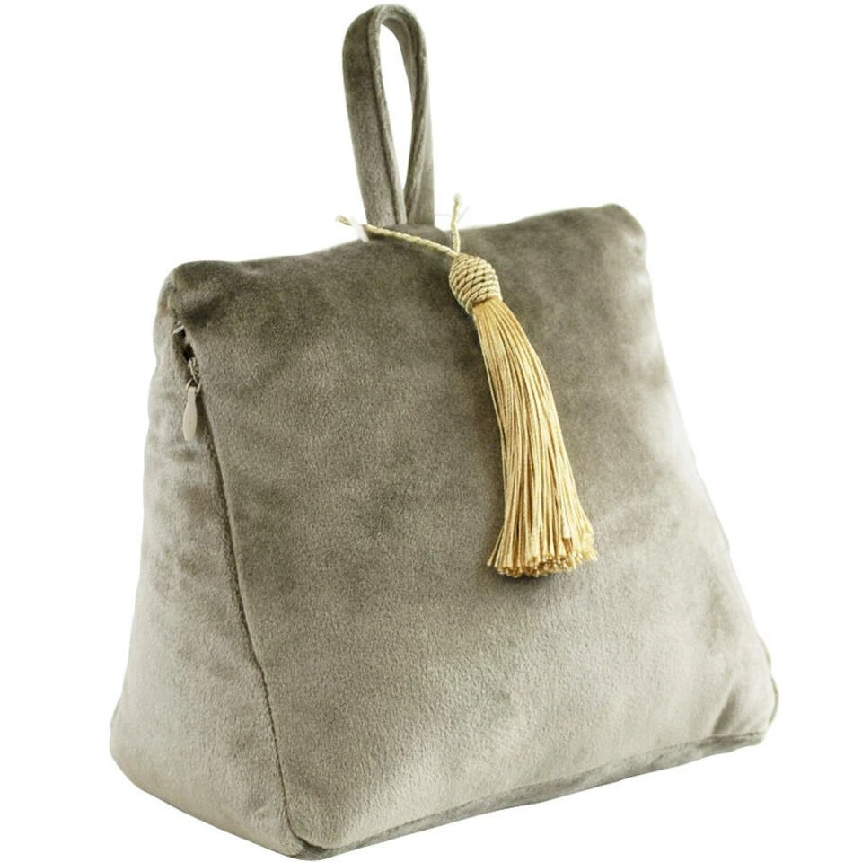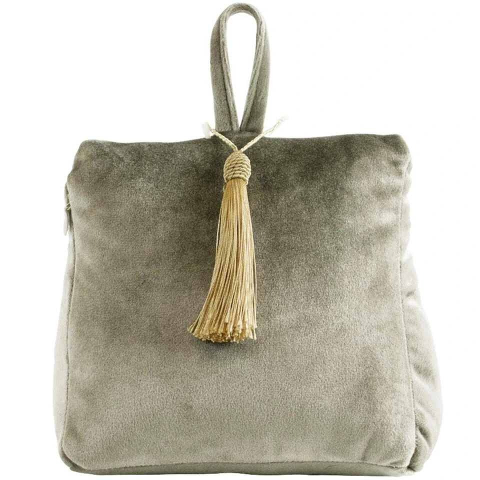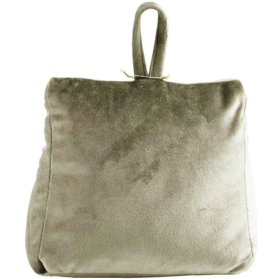 Fluwelen deurstop met decoratie kwast. De deurstopper is makkelijk te verplaatsen door middel van de lus aan de bovenkant. Door het zachte materiaal ontstaan er geen krassen op deuren en vloeren. Kleur: olijf groen. Materiaal: fluweel, polyester. Formaat: ca. 18 x 11 x 18 cm. Er wordt aangeraden om de deurstop af te nemen met een licht vochtige doek.