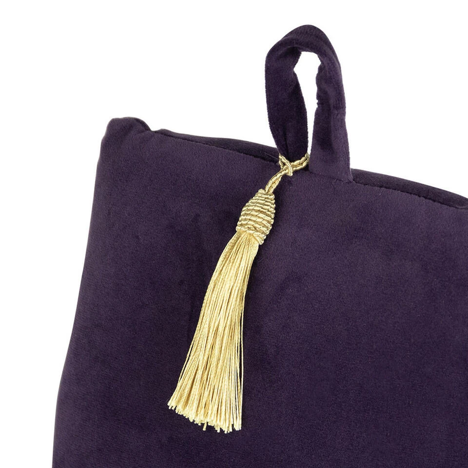 Deurstopper Block met kwastje in de kleur velvet paars met ongeveer 1 kilo gewicht voor binnendeuren met optil/verplaats lus. Afmetingen: 18 x 10 cm. Gemaakt van polyester en vulling. Super handig artikel voor elk huis, winkel of kantoor om geen klapperende deuren te hebben.