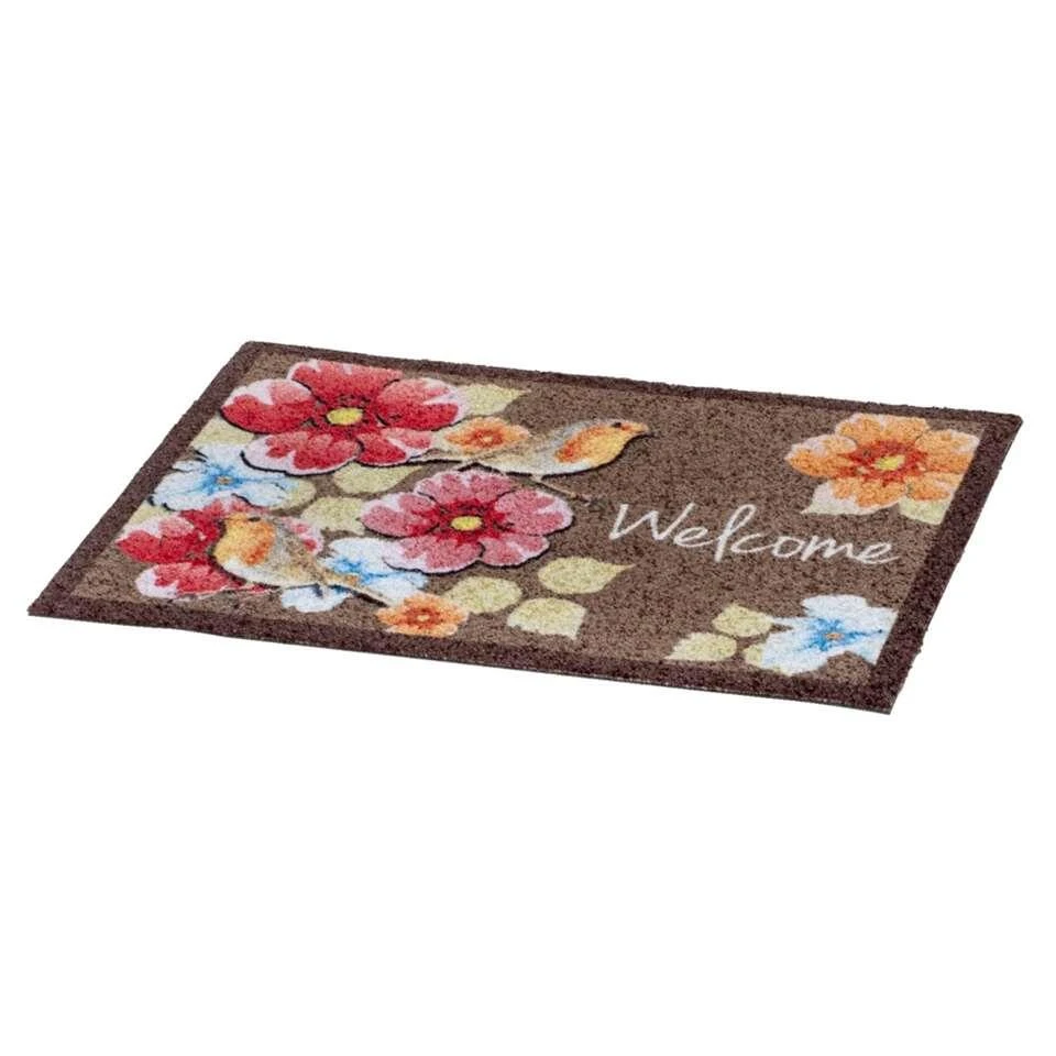 Leuke deurmat versierd met gekleurde bloemen. Kijk goed tussen de bloemen door en je ziet twee vrolijke roodborstjes te zitten.