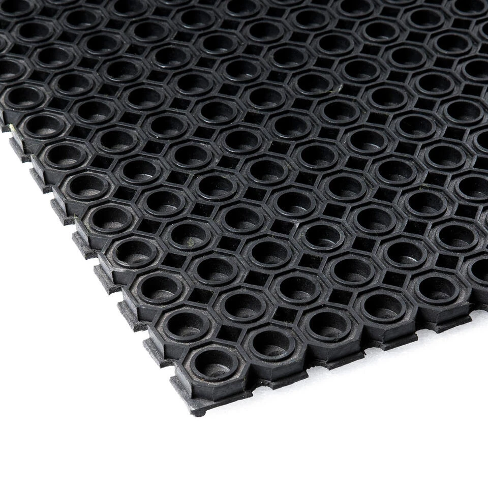 Een ringmat is zowel binnen als buiten te gebruiken. De open bodem zorgt voor een goede afvoer van vloeistoffen en vuil. Dat is niet alleen praktisch bij je entree, maar ook veilig op plaatsen waar de vloer vaak nat is. Doordat de mat van natuurlijk rubber is gemaakt, heeft deze een goede antislip werking, zelfs op koude en natte winterdagen. Tot slot heeft rubber een (geluid)dempende en isolerende werking. Schoonmaken van de ringmat kan heel gemakkelijk door deze uit te kloppen of af te spuiten met een tuinslang/hogedrukspuit.