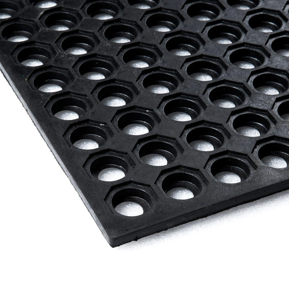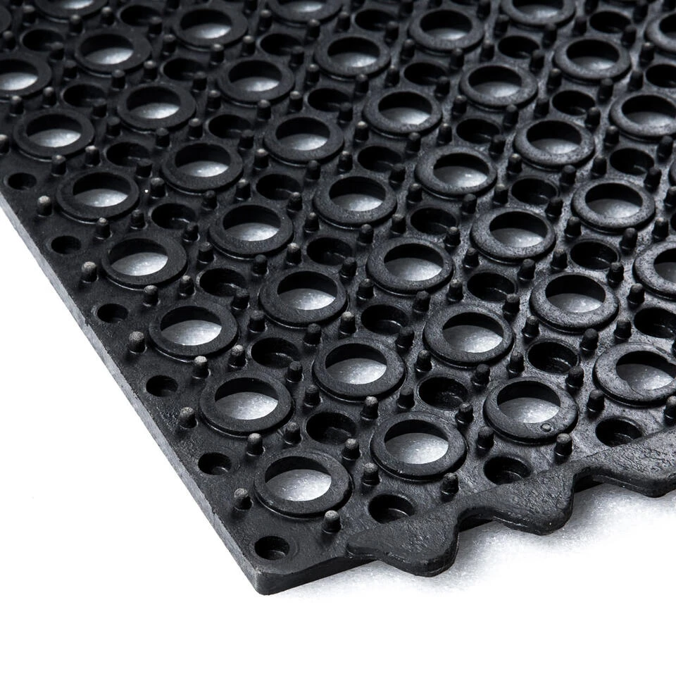 Een ringmat is zowel binnen als buiten te gebruiken. De open bodem en noppenstructuur aan de onderzijde zorgen voor een goede afvoer van vloeistoffen en vuil. Dat is niet alleen praktisch bij je entree, maar ook veilig op plaatsen waar de vloer vaak nat is. Doordat de mat van natuurlijk rubber is gemaakt, heeft deze een goede antislip werking, zelfs op koude en natte winterdagen. Tot slot heeft rubber een (geluid)dempende en isolerende werking. Schoonmaken van de ringmat kan heel gemakkelijk door deze uit te kloppen of af te spuiten met een tuinslang/hogedrukspuit.