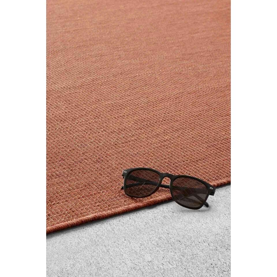 Vloerkleed Bazua is rood en heeft een afmeting van 120×170 cm. Leg dit kleed binnen in huis of creëer de sfeer buiten en leg dit kleed op het terras. Het kleed is bestand tegen alle weersinvloeden.
